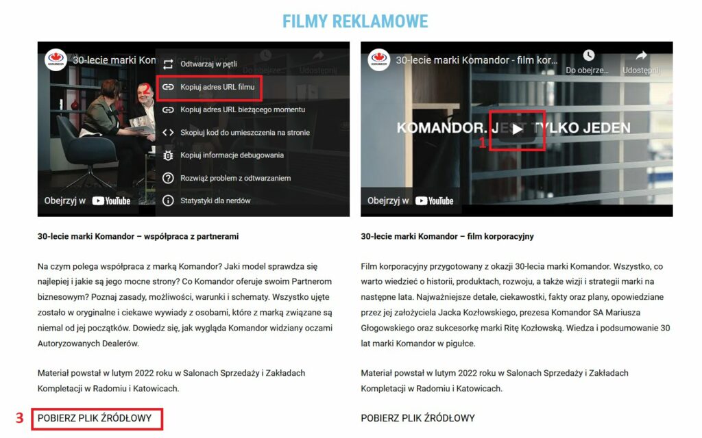 Aby pobrać link do filmu należy na odtwarzaczu nacisnąć prawym przyciskiem, a następnie wybrać „Kopiuj adres URL filmu” (nr 2)